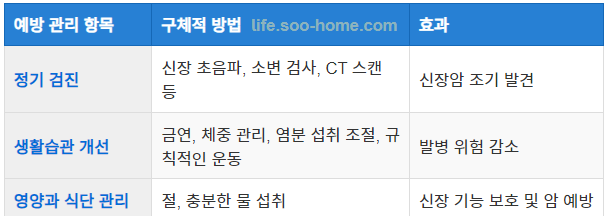 이러한 예방 및 관리 방법을 통해 신장암의 발병 위험을 낮추고, 신장 건강을 장기적으로 유지할 수 있습니다.