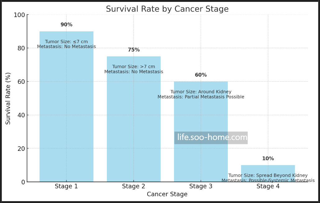 - 완치 가능성: 신장암 1기는 조기 발견 시 5년 생존율이 90% 이상으로 높은 편입니다.