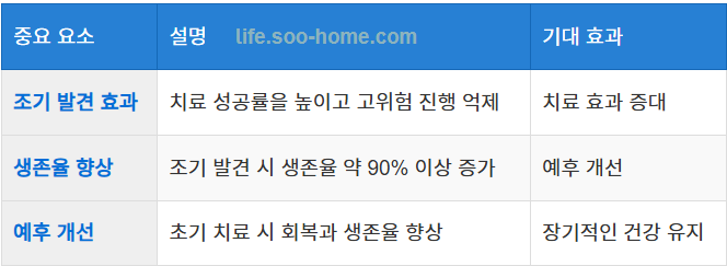 - 생존율 향상: 조기 발견 시 생존율이 약 90% 이상으로 증가