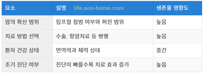 - 암의 확산 범위: 림프절 침범 여부와 암이 퍼진 범위에 따라 생존율 차이가 큽니다.