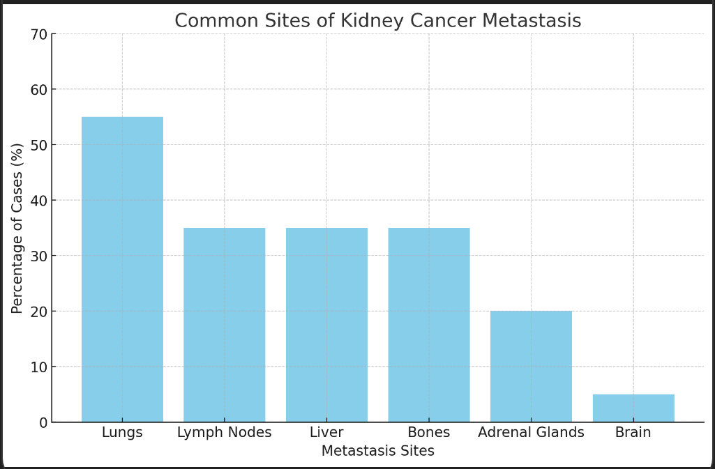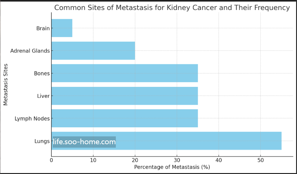 신장암은 주로 폐, 간, 뼈 등으로 전이되며, 전이 부위에 따라 환자의 예후가 달라집니다.