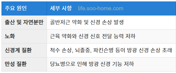 - 주요 원인으로는 근육 약화, 신경 손상, 폐경, 구조적 이상 등이 있음.