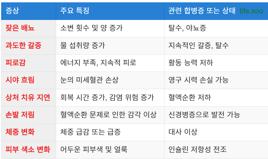 일반적으로 당뇨병 초기 증상은 잦은 배뇨, 극심한 갈증, 피로감 등으로 나타납니다. 이러한 신호를 무시하면 질병이 심각한 상태로 진행될 가능성이 큽니다.