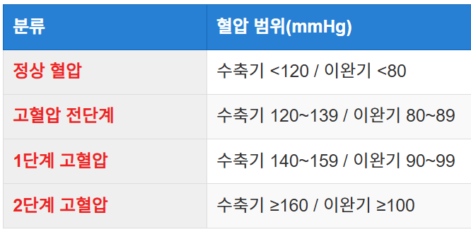 - 정상 혈압: 수축기 혈압 120mmHg 미만, 이완기 혈압 80mmHg 미만
