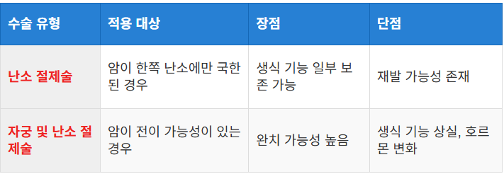 - 환자의 연령, 전반적인 건강 상태, 생식능력 보존 여부에 따라 수술 범위가 조정됨.